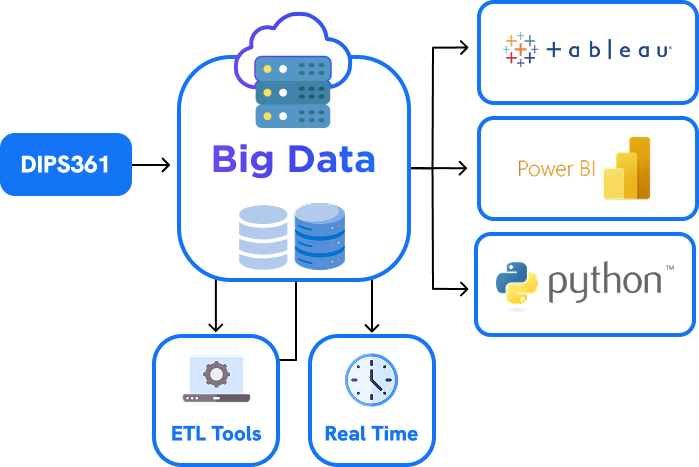 This architecture illustrates how DIPS361 feeds data into a centralized Big Data Platform, which acts as the foundation for managing massive and varied datasets. From here, the data is processed and distributed to: